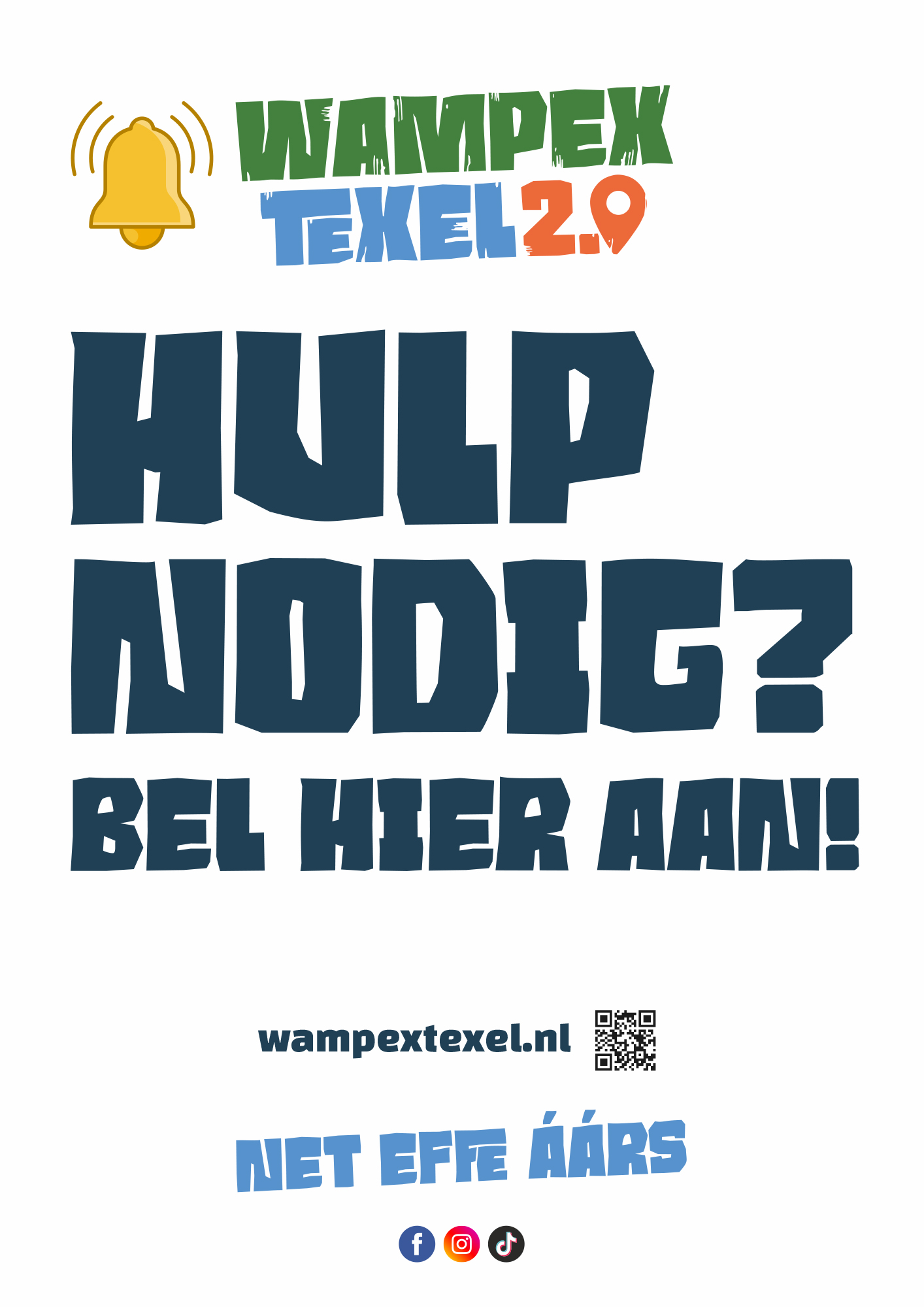 Wil jij de deelnemers tijdens de Wampex Texel 2.0 een handje helpen? Download deze poster, print hem uit en plak hem op het raam of de deur. Zo kunnen de deelnemende teams zien dat jij bereid bent om ze te helpen. Uiteraard kun je de poster ook vooraf al delen op social media zodat jouw deelnemende vrienden weten dat ze bij jou terecht kunnen om hulp.